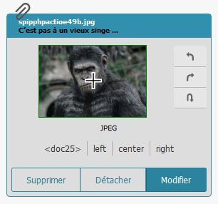 Cliquer sur "left", "center" ou "right" permettra respectivement d’insérer une image alignée à gauche, centrée, ou alignée à droite.